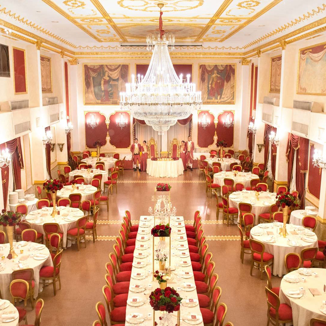 Sale storiche con decorazioni raffinate e spazi all’aperto per banchetti e feste.