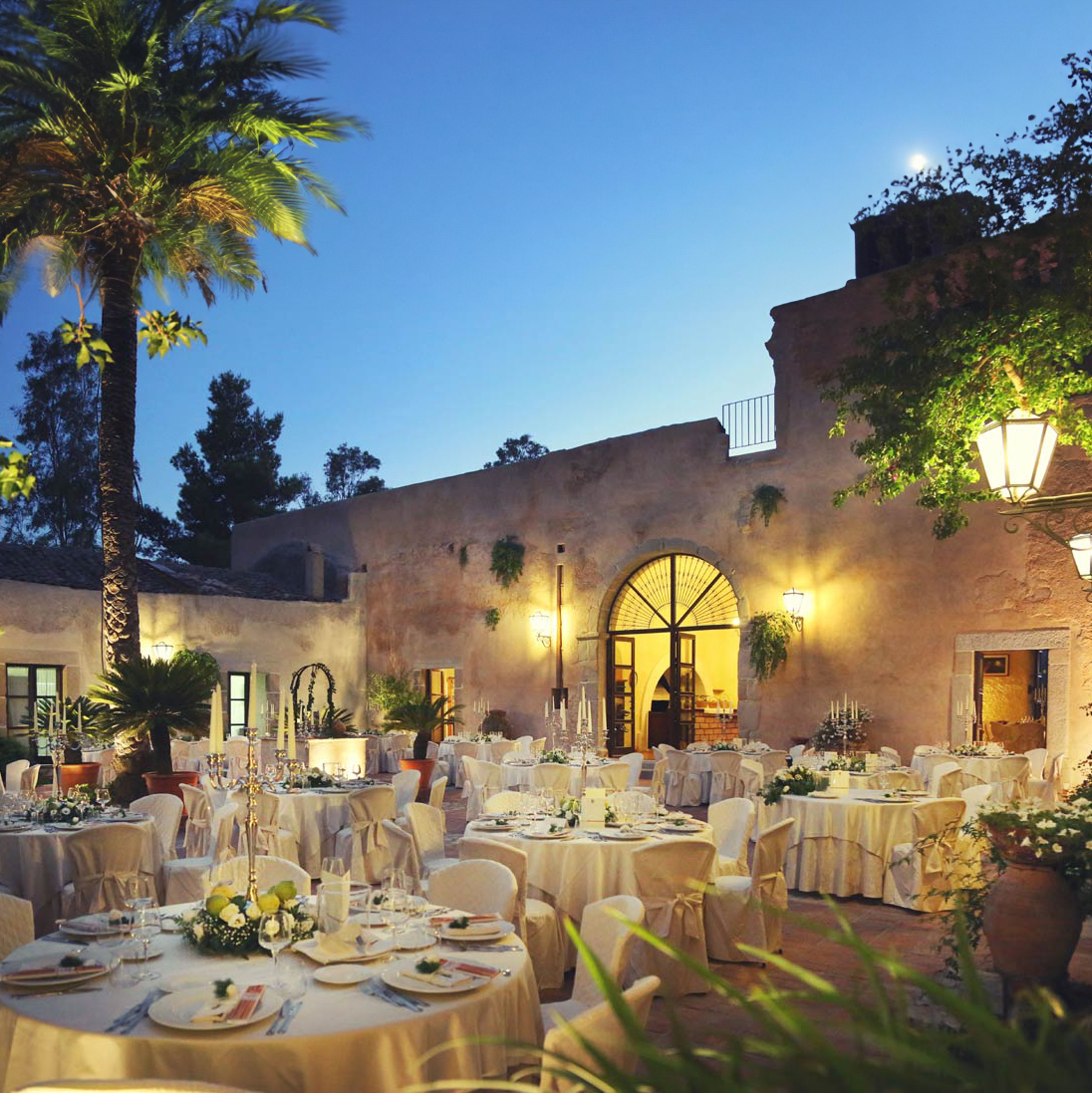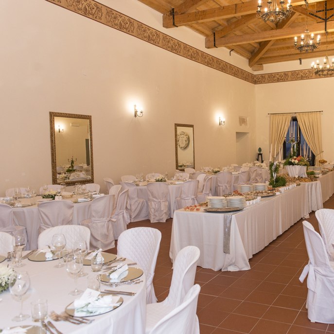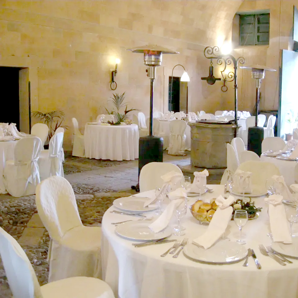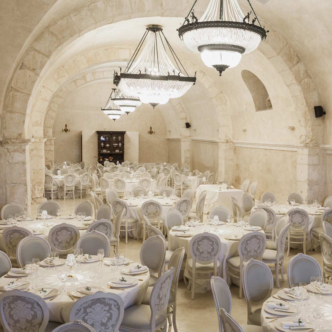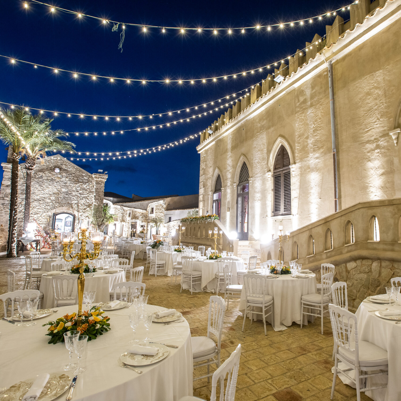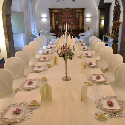 Le ampie sale interne e i cortili esterni sono perfetti per ricevimenti. Gli spazi possono essere allestiti per cene formali, cocktail party e danze. La “Sala dei Baroni” e il “Giardino delle Palme” sono particolarmente popolari per i banchetti.
