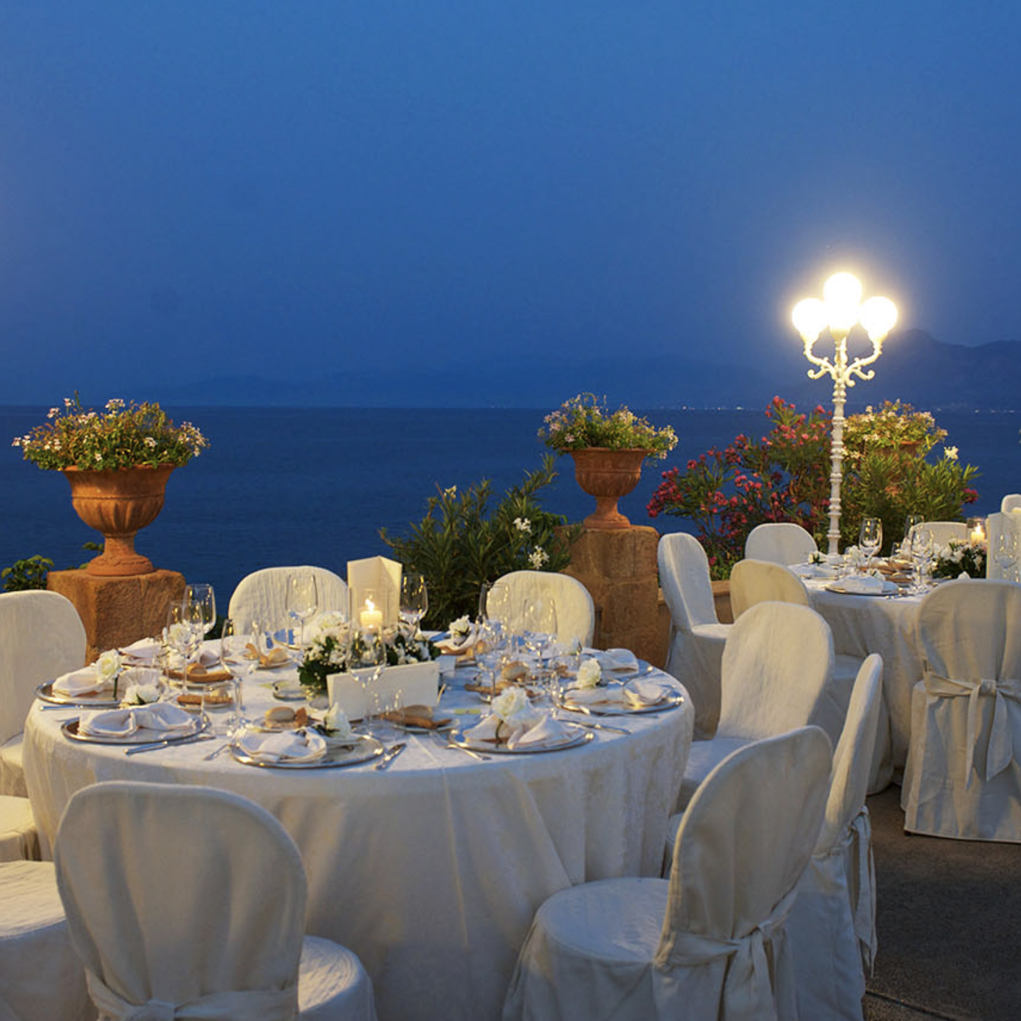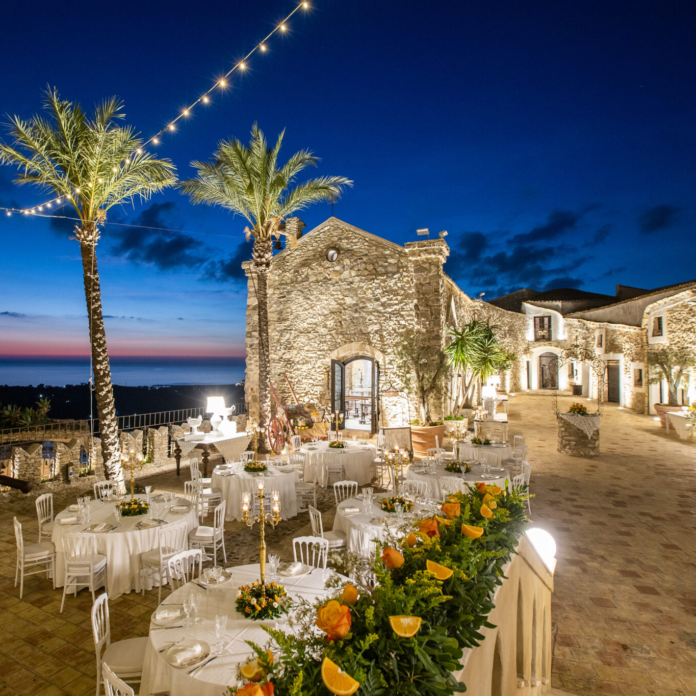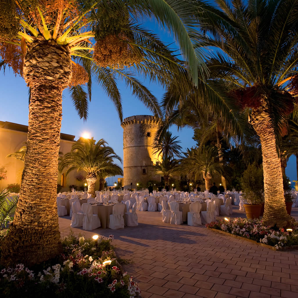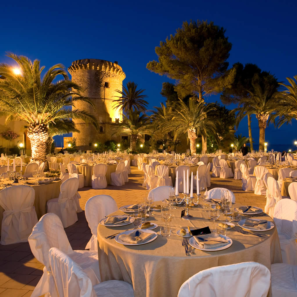 Gli sposi possono scegliere tra la sala ricevimenti, le terrazze sul mare, gli splendidi giardini e l’antica corte con la torre normanna. La struttura è in grado di ospitare eventi con più di 500 ospiti.