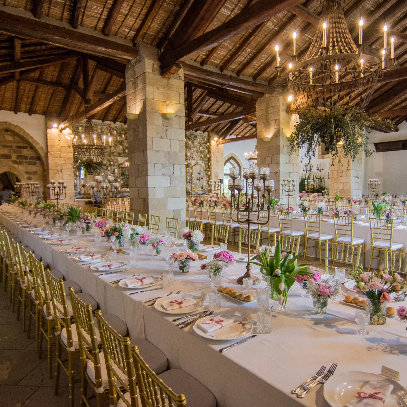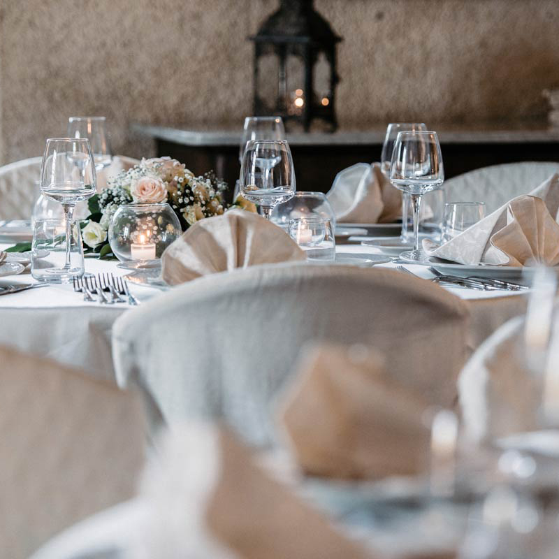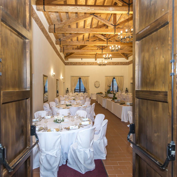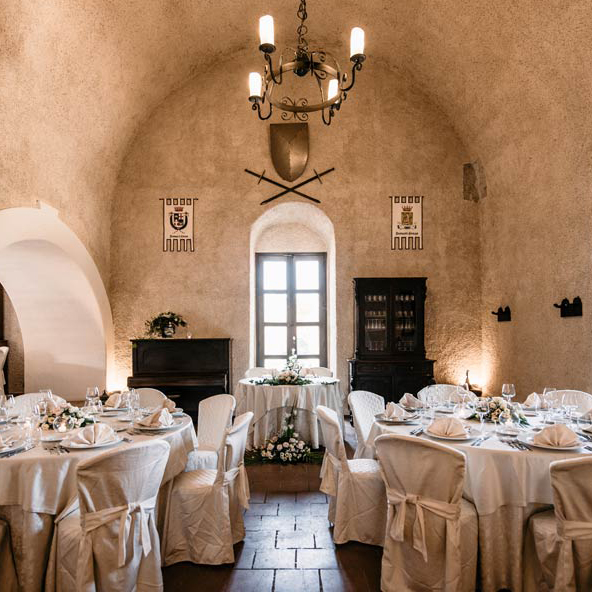 Le sale banchetti del castello possono ospitare fino a 300 persone. Gli spazi esterni sono perfetti per buffet dinamici, mentre gli interni, con le loro suggestioni medievali, sono ideali per cene formali. La sala interna principale può ospitare fino a 170 persone e dispone di un grande camino per i mesi invernali. È presente anche una sala riservata nel piano interrato, ideale per degustazioni enogastronomiche o per intrattenere i piccoli ospiti.