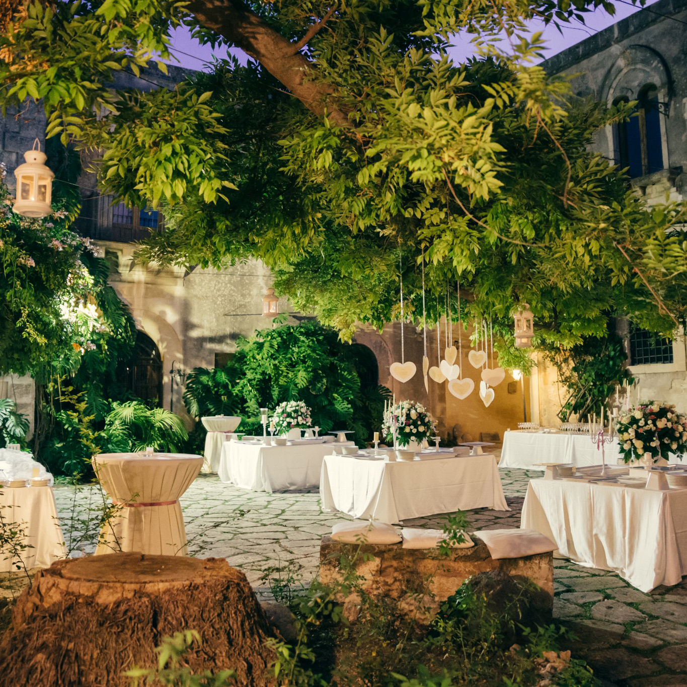 Gli sposi possono scegliere tra diverse location, tra cui giardini, sale interne e la corte interna, per organizzare cerimonie romantiche. Le terrazze e i giardini offrono una cornice perfetta per fotografie e momenti indimenticabili.