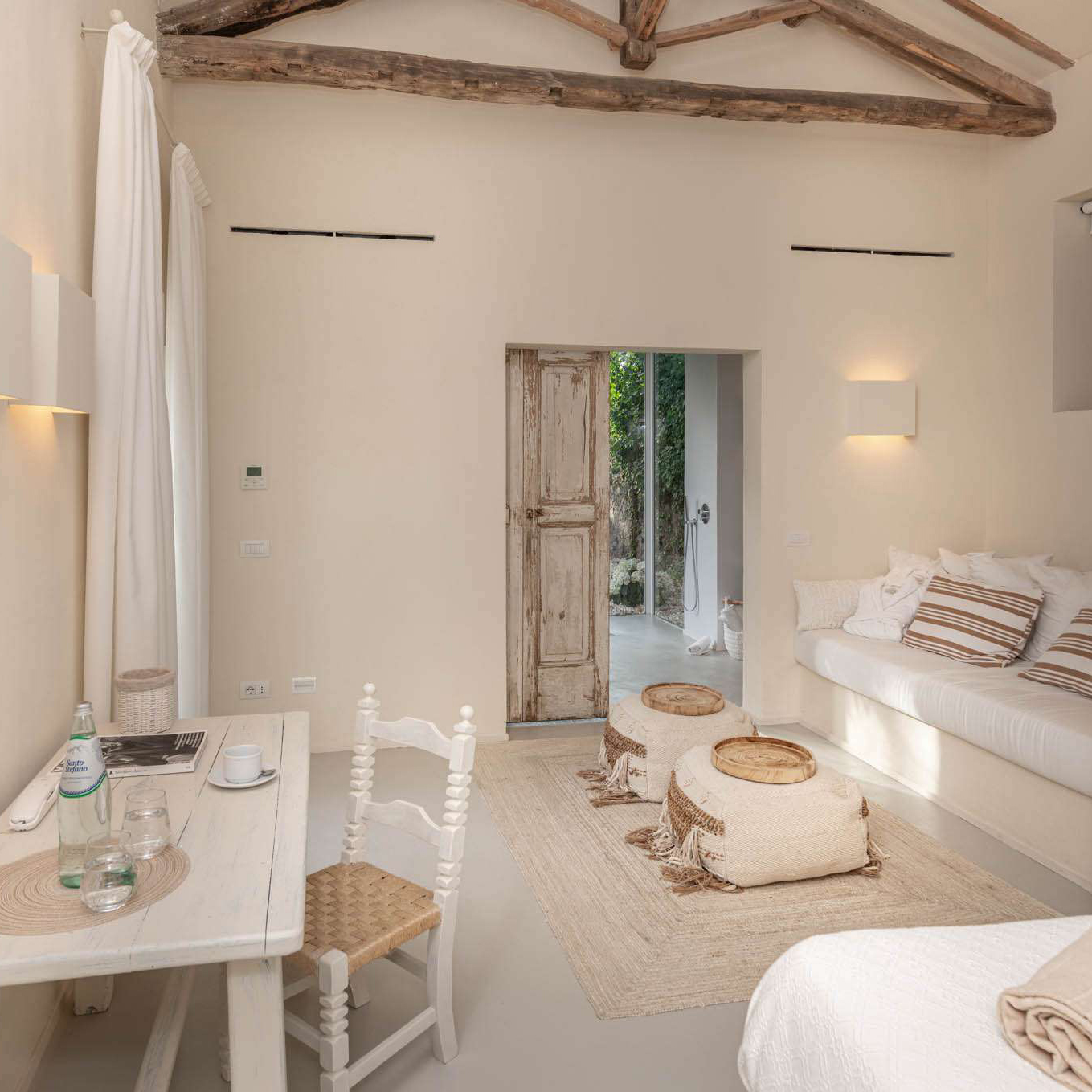 Le suite del castello sono arredate con eleganza e dotate di comfort moderni, come freschi soffitti a travi di legno, pavimenti in cotto antico e bagni in marmo.